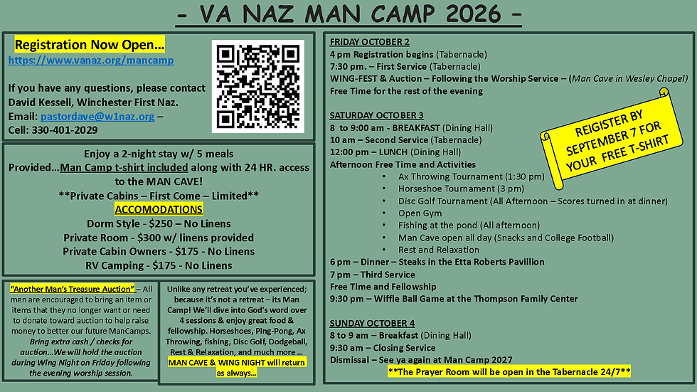 Unlike any retreat you've experienced; because it's not a retreat -- it's Man Camp! We'll dive into God's word over 4 sessions & enjoy great food and fellowship. Horseshoes, pin-pong, ax throwing, fishing, flag football, disc golf, dodgeball, rest & relaxation, and much more...